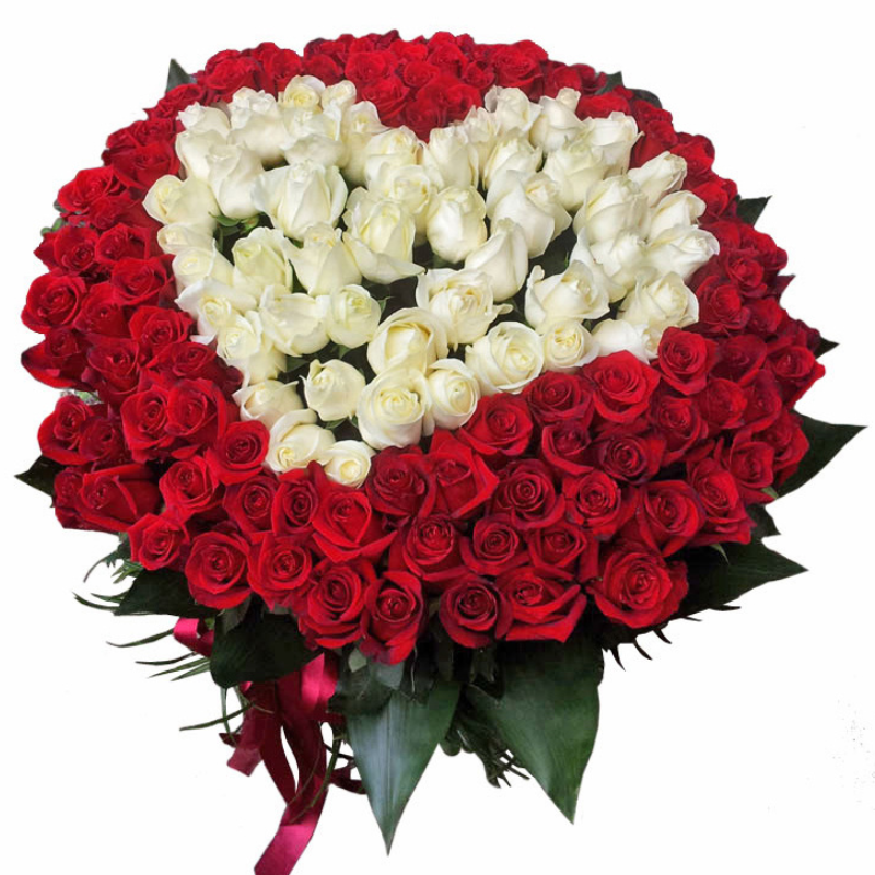 Букет состоит из 101 красная и белая роза, прозрачная упаковка, атласная лента.