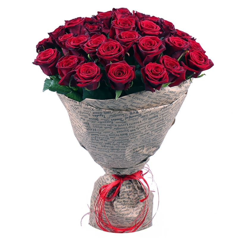 Букет состоит из 35 бордовых роз, крафт, атласная лента.