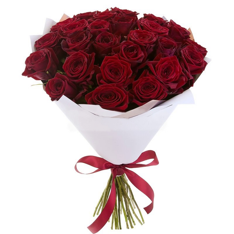 Букет состоит из 25 бордовых роз, крафт, атласная лента.
