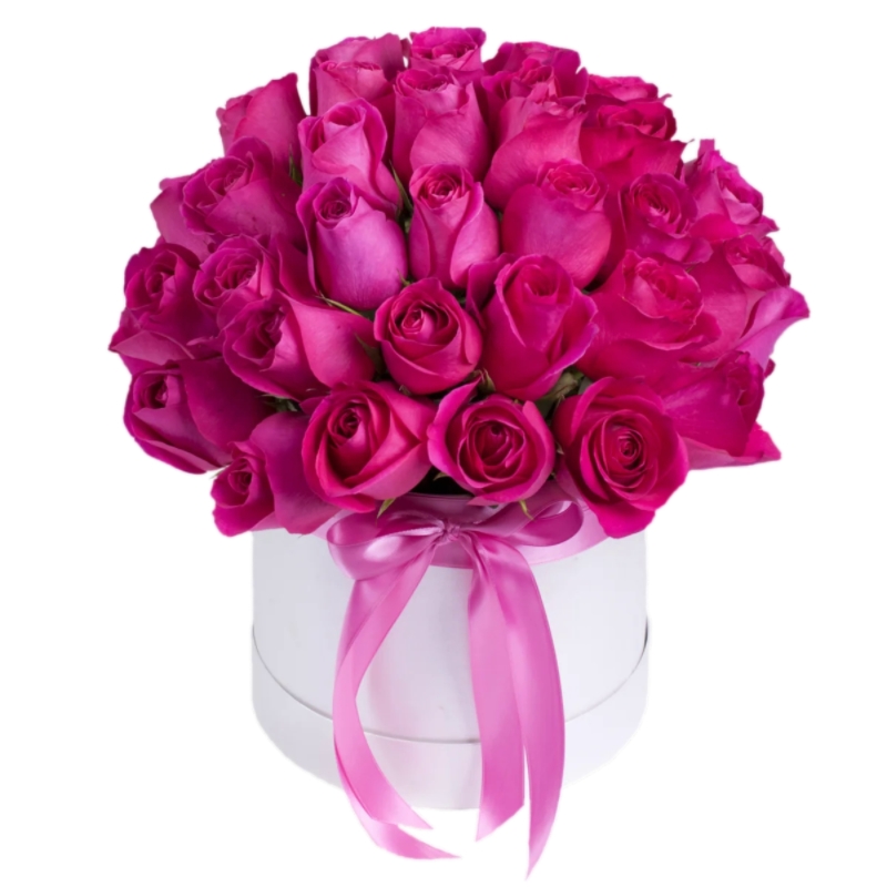 Букет состоит из 35 малиновых роз, коробка, оазис.