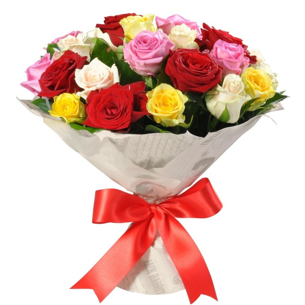 Букет состоит из 6 красных роз, 5 белых роз, 5 желтых роз, 5 розовых роз, крафт, красная лента.