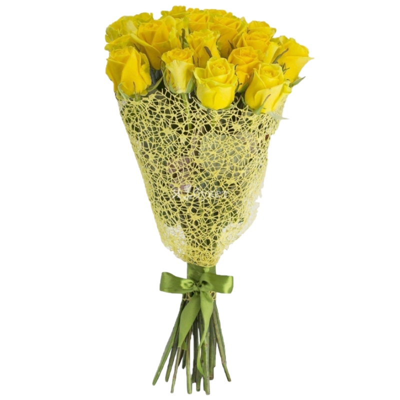 Букет состоит из 17 желтых роз, красивая упаковка, атласная лента.