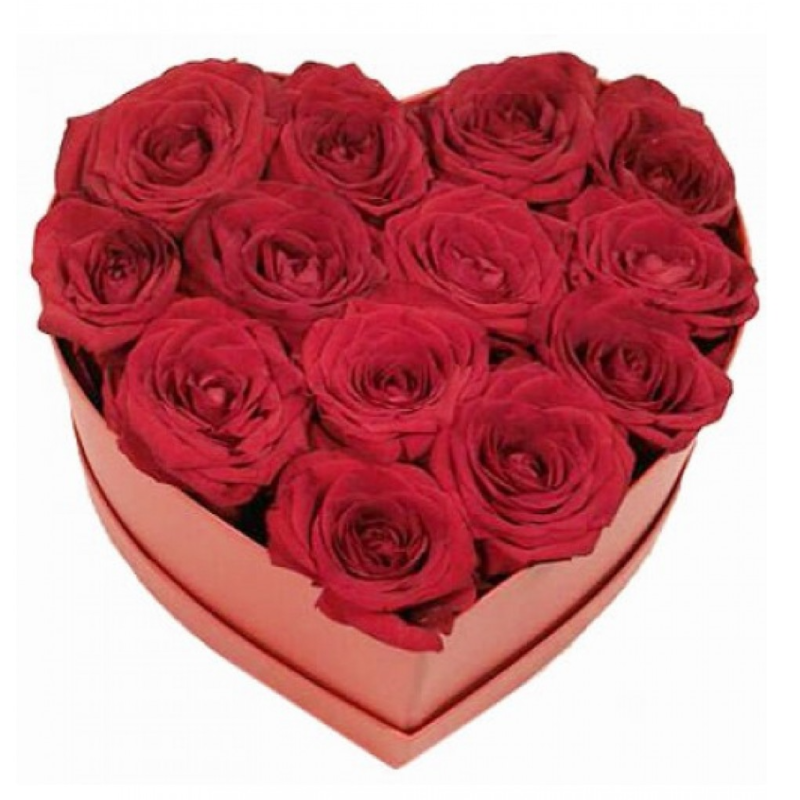 13 красных роз, коробка в виде сердца.
