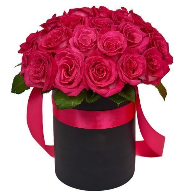 Букет состоит из 25 малиновых роз, зелень, коробка, оазис.