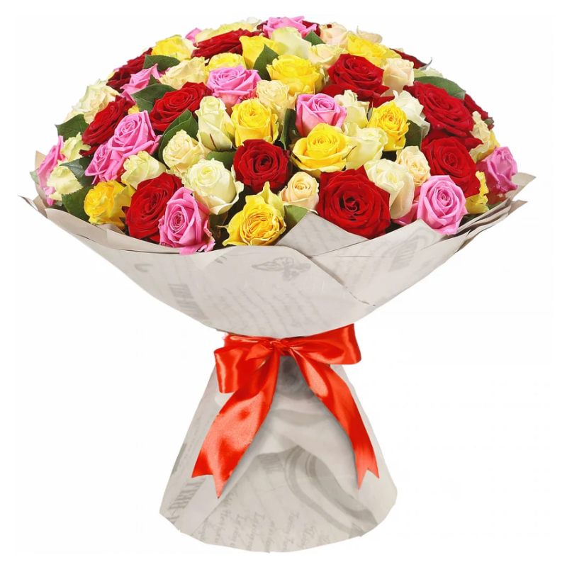 Букет состоит из MIX из 101 желтой / красной / белой / розовой розы, красивая упаковка, лента.