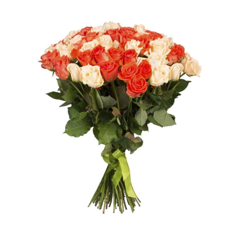 Букет состоит из 23 оранжевые розы, 22 кремовые розы, прозрачная упаковка, атласная лента.