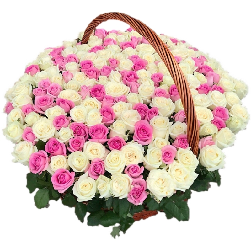 Букет состоит из MIX из 201 белой и розовой розы, зелень, корзина, оазис.