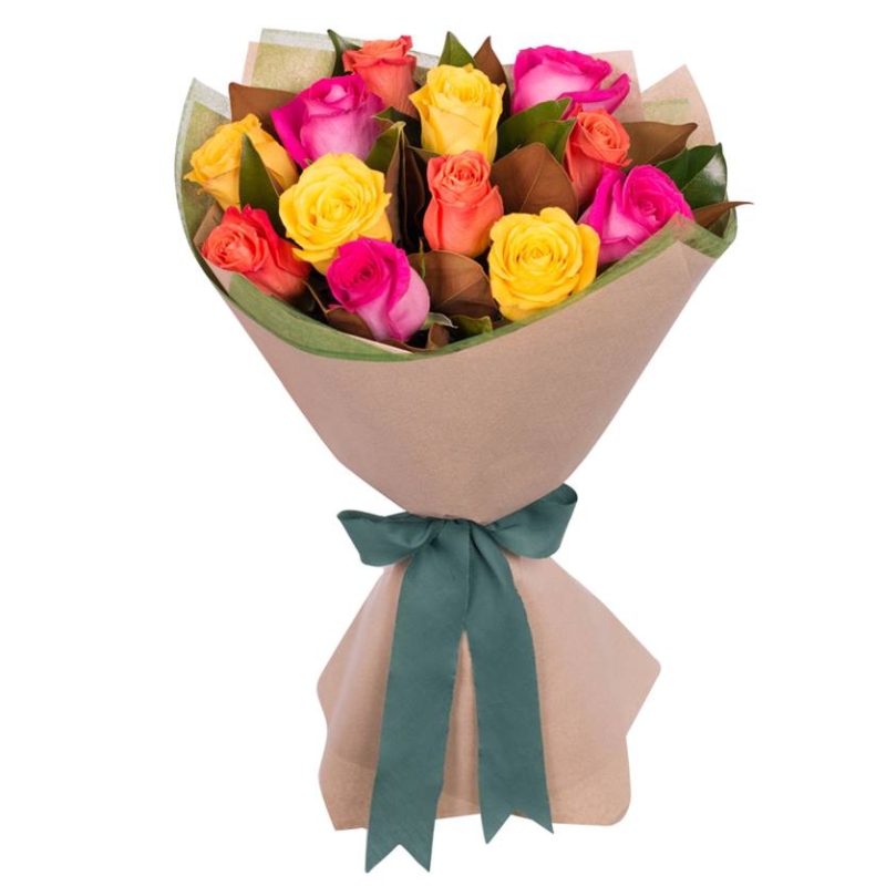 Букет состоит из MIX из 13 роз, крафт, атласная лента.