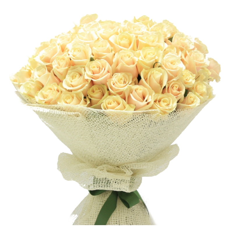 Букет состоит из 55 кремовых роз, красивая упаковка, атласная лента.