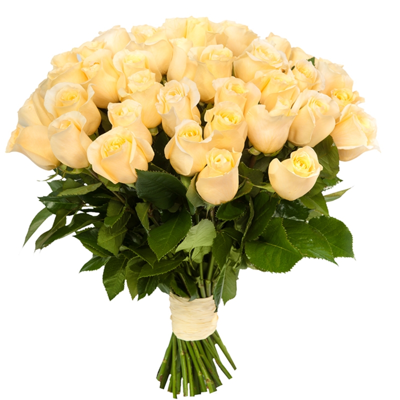 Букет состоит из 45 кремовых роз, прозрачная упаковка, атласная лента.